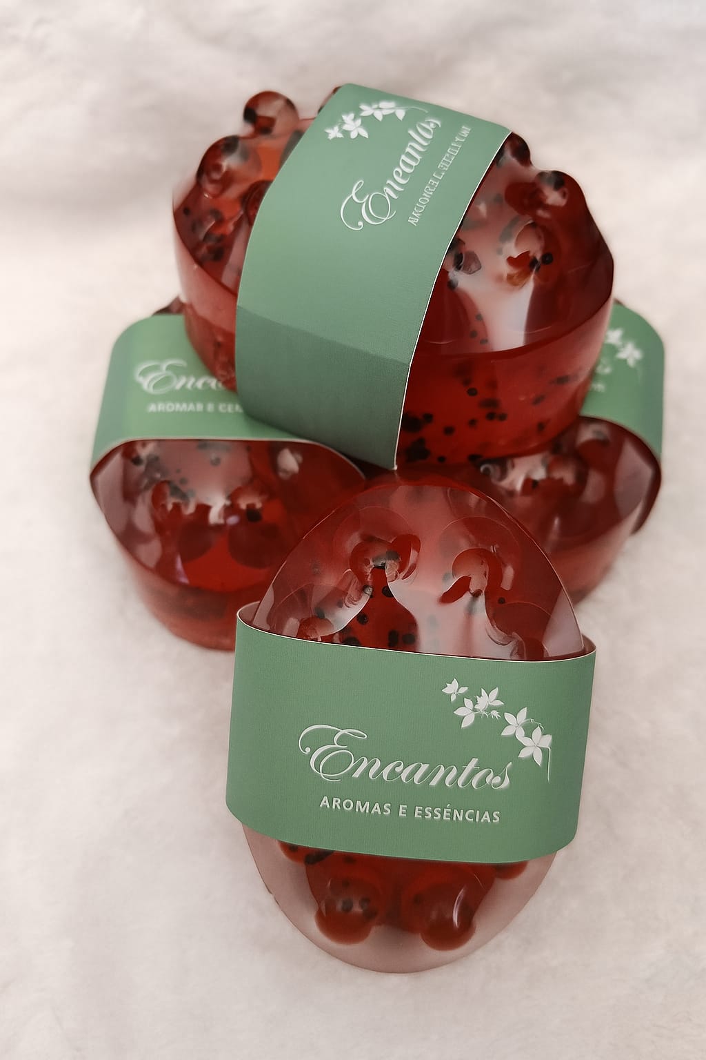 Composição: base glicerinada, lauril, essência de morango com champgane, corante de cosmético, extrato glicólico de aloe vera e semente de colza.