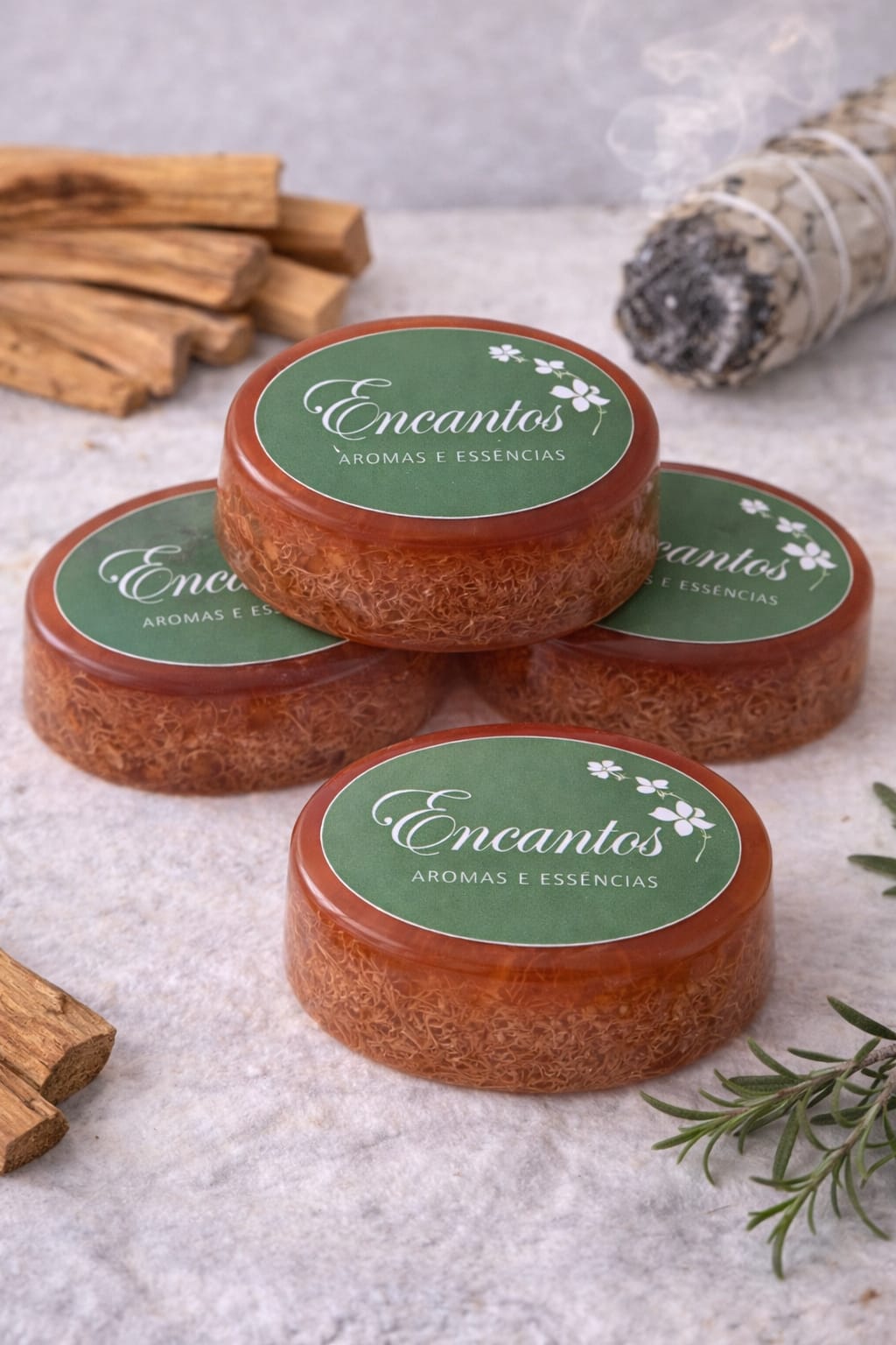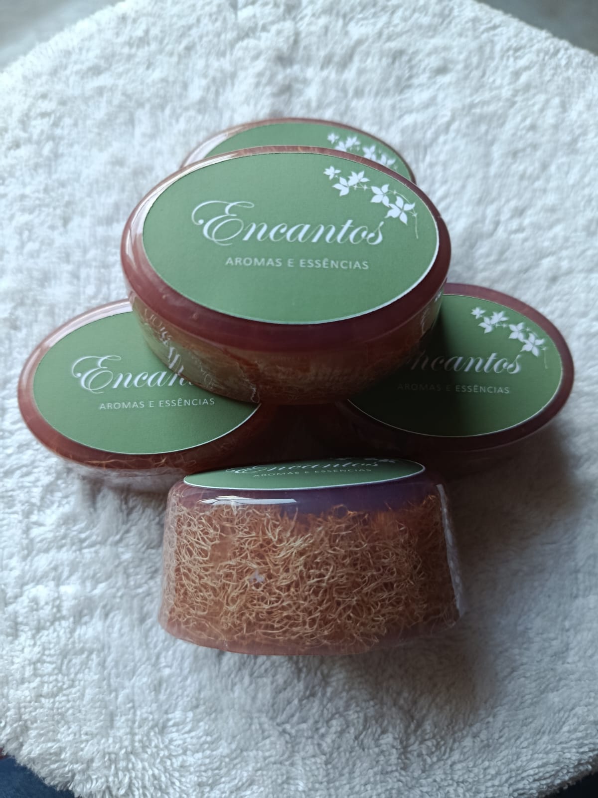 Composição: base glicerinada, lauril, essência de palo santo, corante de cosmético, extrato glicólico de aloe vera e bucha vegetal.
